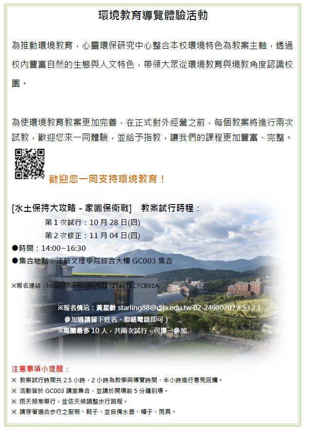想知道法鼓文理學院自2014落成,如何落實自然環保,如何將校園建築與自然環境和諧共存,將建築融入大地,同時周延規劃了水土保持相關設施!!! 為推動環境教育,心靈環保研究中心整合本校環境特色為教案主軸,透過校內豐富自然的生態與人文特色,帶領大眾從環境教育與境教角度認識校園。 本體驗活動為正式對外營運前的試教,每一教案將進行2次試教,歡迎一同體驗並給予指教,讓我們的課程更加豐富、完整。