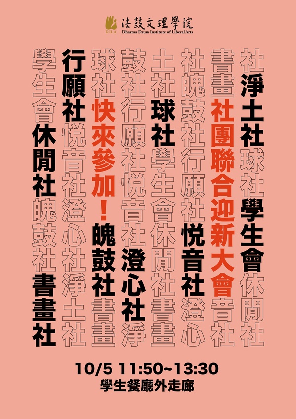 諸位師長、同學安 阿彌陀佛 下周三10/05中午11:50~13:30 將於學生餐廳外舉行聯合社團迎新大會 學生會與各社團敬邀各位一同參與