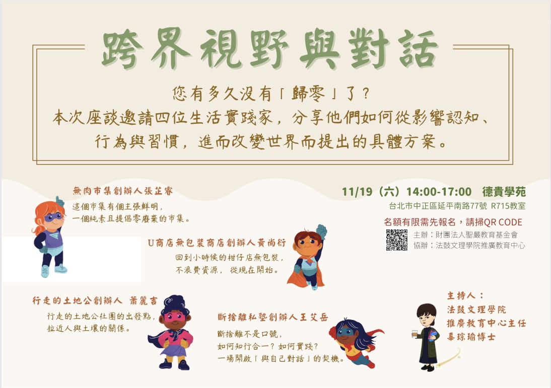 諸位師長、同事、同學,大家好 聖嚴教育基金會與推廣教育中心將於11月19日舉辦一場跨界對談的講座。 本次座談邀請四位生活實踐家,分享他們如何從影響認知、行為與習慣,進而改變世界「提出具體」的方案。 歡迎有興趣的同仁、同學一同來聆聽與學習。