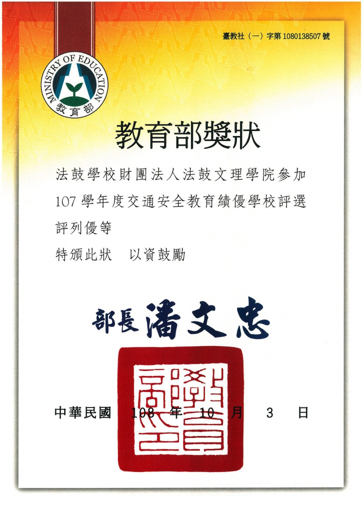 恭賀本校於107學年度交通安全教育績優學校「大專校院組」獲得優等獎項的殊榮
