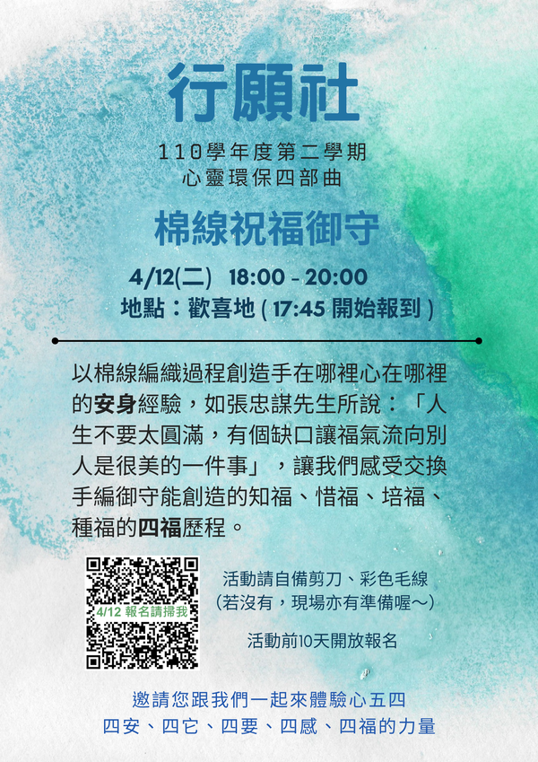 邀請您一同來參與行願社本學期第二場活動【棉線祝福御守】 活動請自備剪刀、彩色毛線 (若沒有,現場亦有準備喔)
