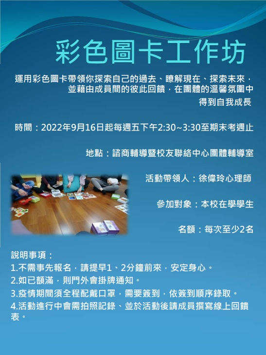 活動資訊 時間:自2022.09.16起,每周五下午2:30~3:30,至本學期期末考周為止