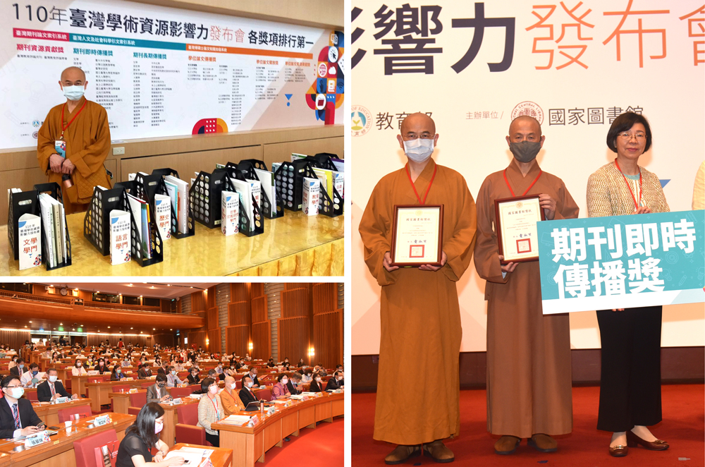4月26日,國家圖書館「110年臺灣學術資源影響力」發布會中頒發本校「期刊即時傳播獎」,並由校長惠敏法師親自代表學校出席受獎。恭賀本校《法鼓佛學學報》期刊榮獲哲學宗教學門「期刊即時傳播獎」,自去年得此獎項後,今年再次獲此殊榮。惠敏法師係擔任本學報主編,期許學報出版優良學術論文之外,亦鼓勵佛教研究風氣,培養更多有志於佛教學術研究之人才。