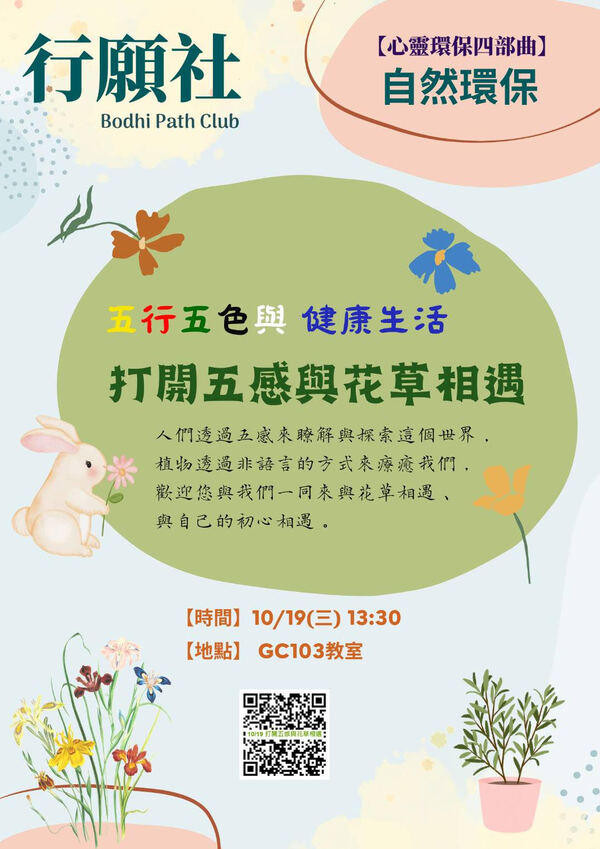 邀請您一同來參與行願社本學期第二場活動【10/19五行五色與健康生活-打開五感與花草相遇】 本次活動特別邀請園藝治療老師帶著大家一同來覺察與發現, 透過植物的相伴,打開五感、體驗大自然的療癒力量。