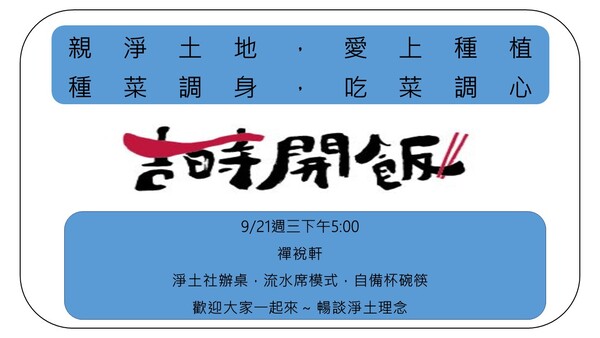 活動資訊 迎接新學期的開始,淨土社將於9/21下午5:00於禪悦軒辦桌,