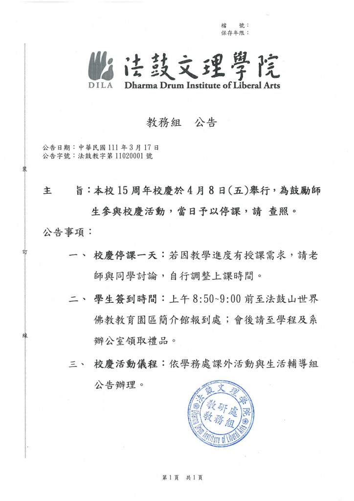 【教務組】本校15周年校慶於111年4月8日(五)舉行,為鼓勵師生參與校慶活動,當日予以停課