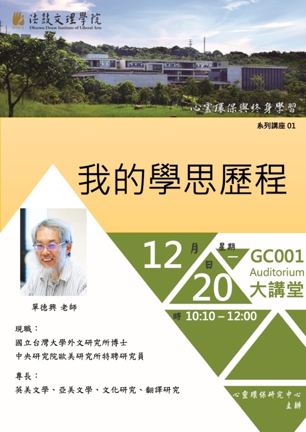 各位老師、同學好, 110學年上學期心靈環保講座"心靈環保與終身學習"系列課程專題演講,第九場來囉~ 歡迎有興趣的同仁、同學一同來聆聽與學習。
