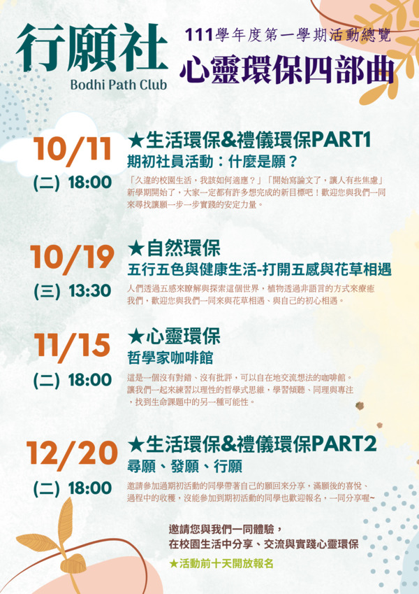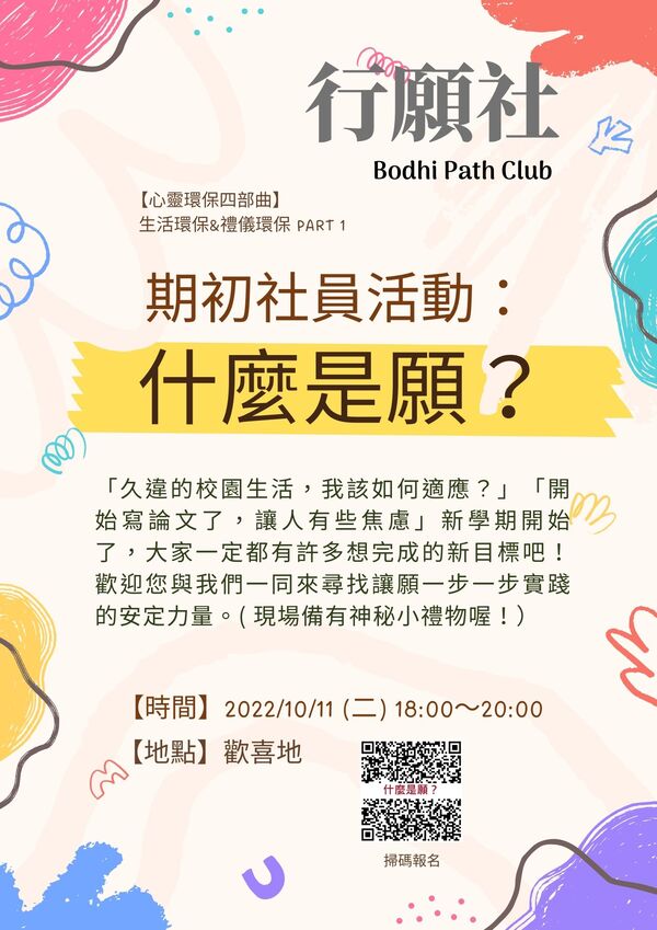 邀請您一同來參與行願社本學期第一場活動【 10/11期初社員活動暨「什麼是願?」 】 「久違的校園生活,我該如何適應?」「開始寫論文了,讓人有些焦慮」