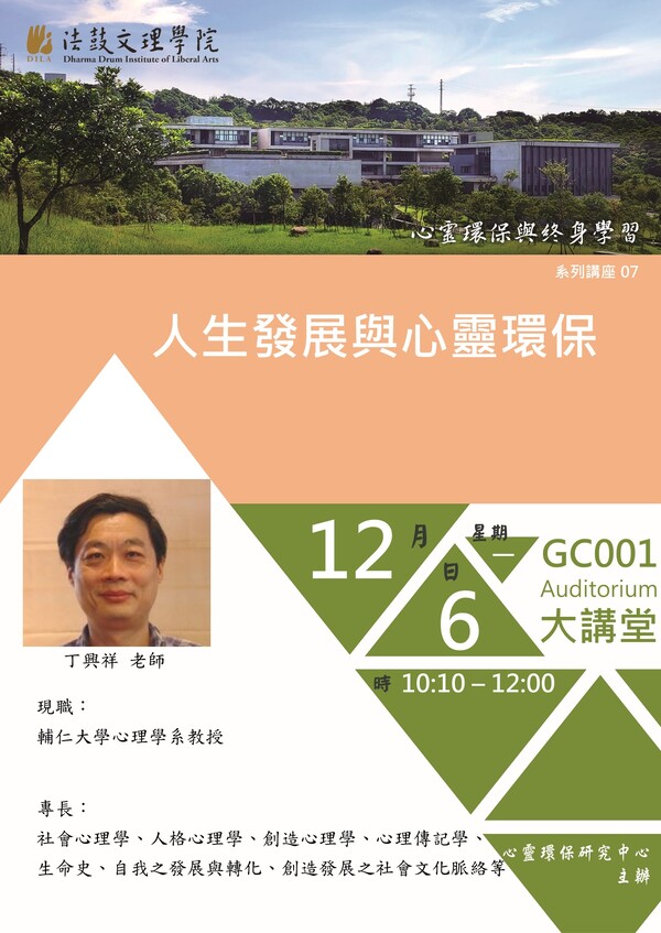 講座資訊: 講 題:人生發展與心靈環保