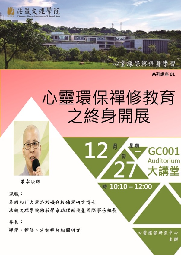 講座資訊: 講 題:心靈環保禪修教育之終身開展