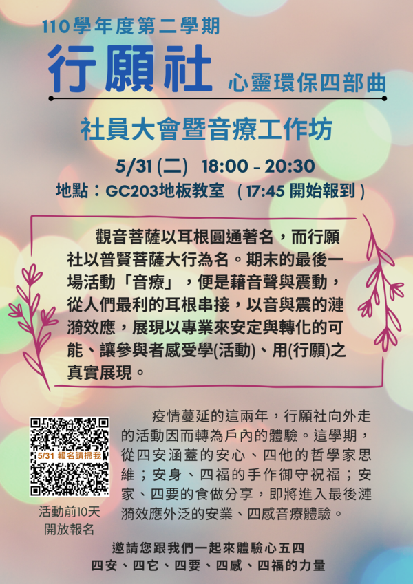 邀請您一同來參與行願社本學期最後一場活動【5/31社員大會暨音療工作坊】 音療是什麼?可以怎樣療癒人的身心靈?欲知其詳,歡迎加入我們,來一場感恩、感謝、感動、感化的四感奇幻之旅。