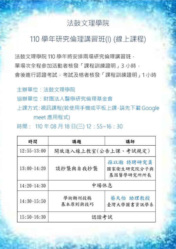 本校110學年「研究倫理講習班(Ⅰ)」誠摯邀請校內教師、研究生、研究人員報名參加。 一、配合中央流行疫情指揮中心之全國疫情警戒,本學期研究倫理講習班改為線上講習,全程參加本活動者核發「課程訓練證明」3小時,會後進行認證考試,考試及格者另核發「課程訓練證明」1小時。