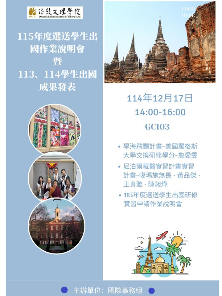 國際事務組將於12月17日(三)14:00-16:00舉辦115年度選送學生出國申請作業說明會及113、114年度出國學生成果分享會,歡迎踴躍參加。