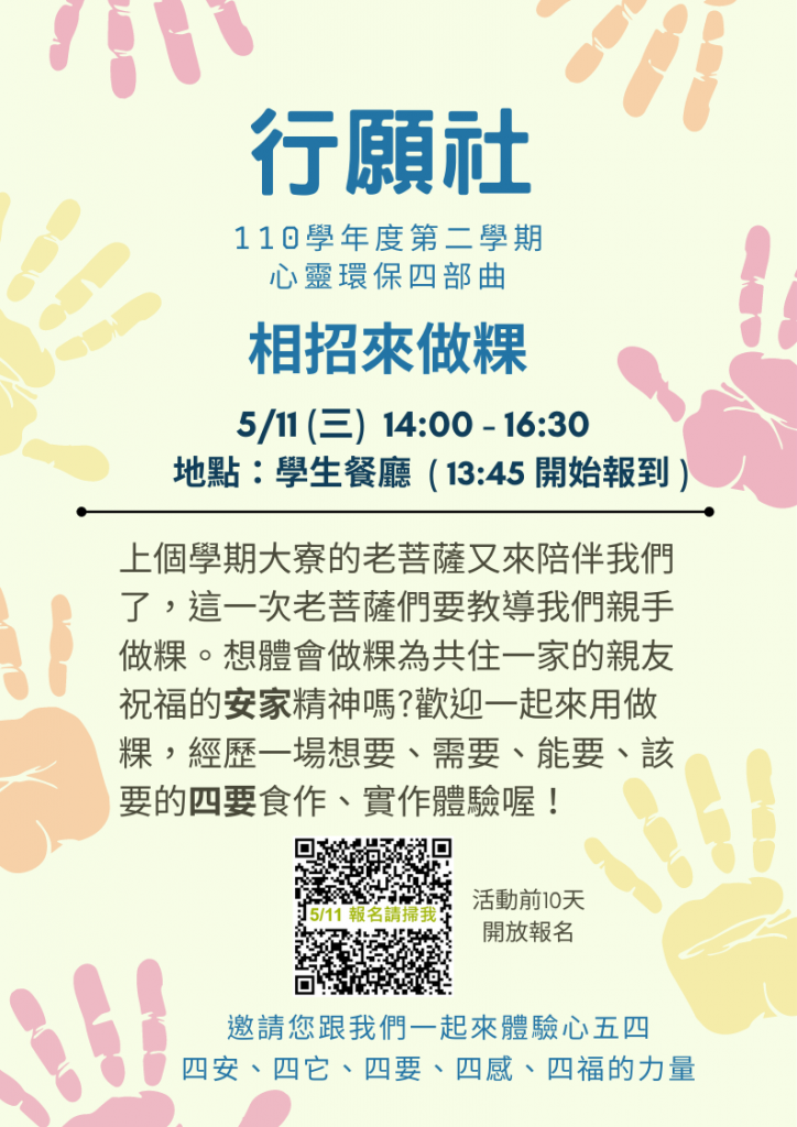 邀請您一同來參與行願社本學期第三場活動【相招來作粿】 這次我們邀請到大寮老菩薩來教我們動手做芋粿,今天開放報名囉~~大家千萬別錯過!