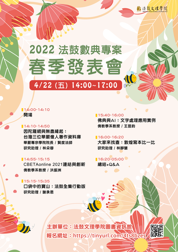 2022年數位典藏組的專案春季發表會來囉~ 快來看看這一年來,專案增加了什麼新的內容或是新的功能!!! 發表會群星雲集,內容精彩可期 想要第一手知道佛學數位資源的最新發展的你,不要錯過了喔!!
