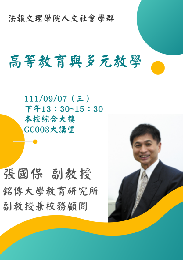各位老師、同仁好, 因應本校校務計畫多元教學及學校評鑑, 特別邀請銘傳大學教育研究所兼校務顧問張國保副教授,分享「高等教育與多元教學」, 張教授對於學校評鑑也有豐富經驗, 當天也會分享有關本校學校評鑑之相關經驗。 歡迎各位老師及同仁踴躍參加!