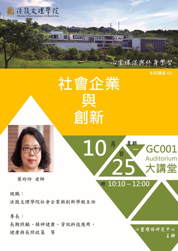 各位老師、同學好, 110學年上學期心靈環保講座"心靈環保與終身學習"系列課程專題演講,第三場來囉~ 歡迎有興趣的同仁、同學一同來聆聽與學習。