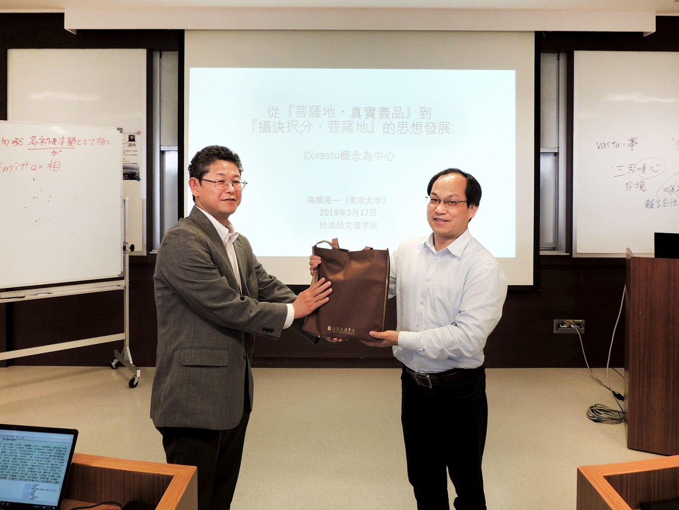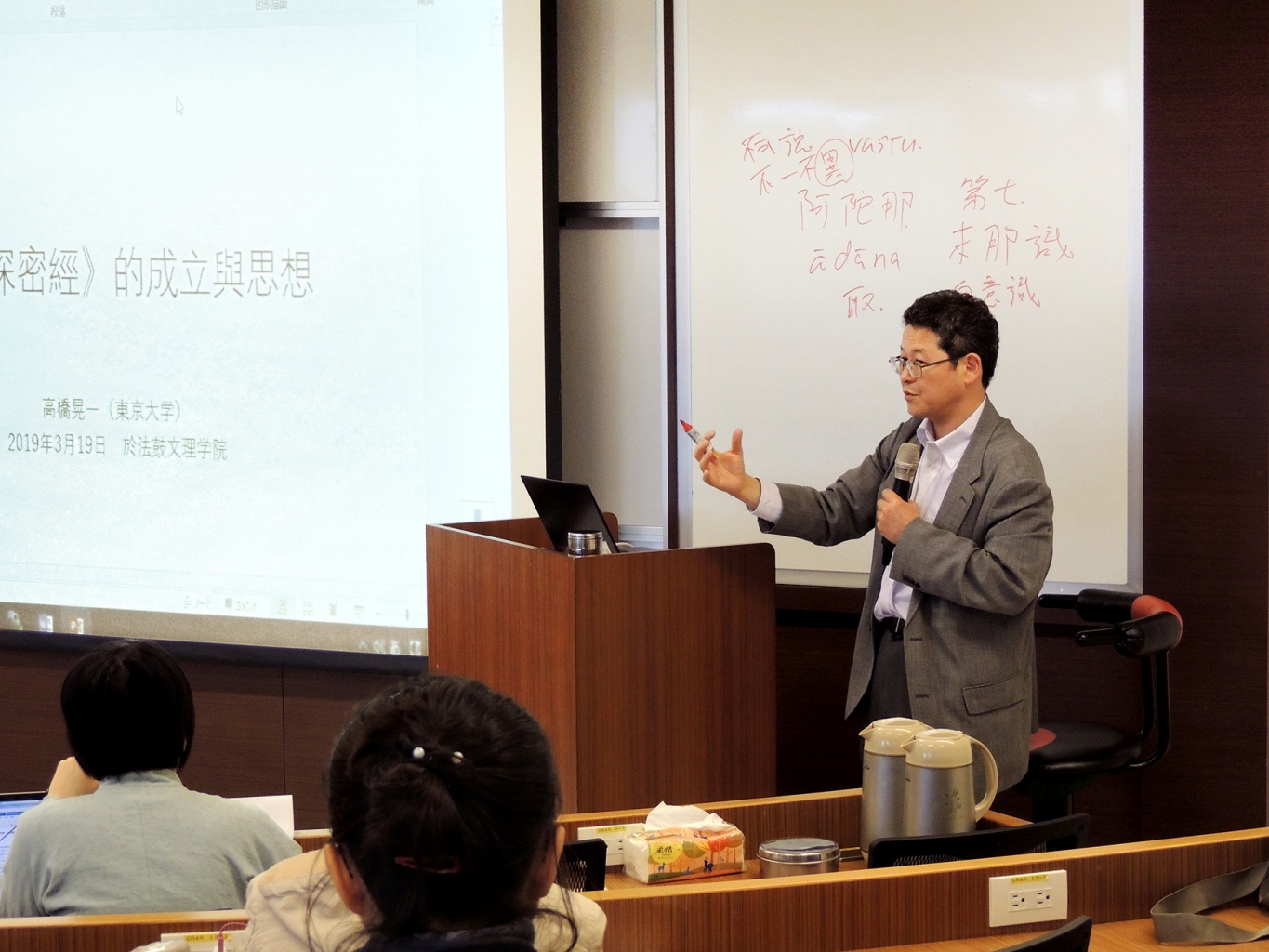 法鼓文理學院佛教學系於2019年3月18、19日舉辦唯識學講座,由日本東京大學高橋晃一教授主講。 高橋晃一教授目前任職於日本東京大學人文社會系研究科,長年致力於佛教唯識學研究,成果豐碩。其學術論著《『菩薩地』「真実義品」から「摂抉択分中菩薩地」への思想展開 : vastu概念を中心として》內文探討佛學鞭辟入裡,受到臺灣學術界關注,2011年「慈氏學聖典漢譯計畫」更將之翻譯為中文出版發行。 法鼓山方丈果暉法師早年也曾留學日本,為表竭誠歡迎之意,於3月18日設宴歡迎高橋教授的到來。高橋教授的講座共分三個主題,兩個場次,每個場次3小時進行。講題包括:「從『菩薩地・真實義品』到『攝決擇分・菩薩地』的思想發展:以vastu概念為中心」、「《解深密經》的成立與思想」及「佛教用語用例集 Bauddha Kośa (五位七十五法關連用語的定義)」。