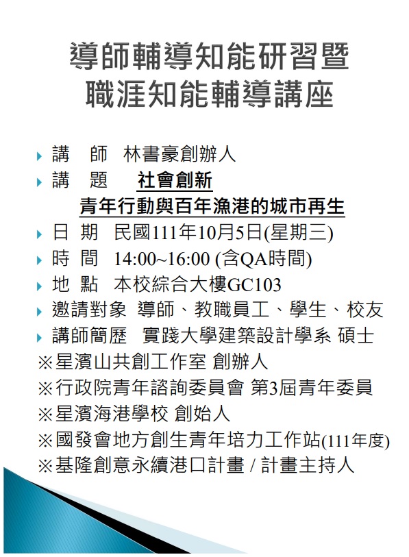 活動資訊 類型: 導師輔導知能研習暨 職涯知能輔導講座