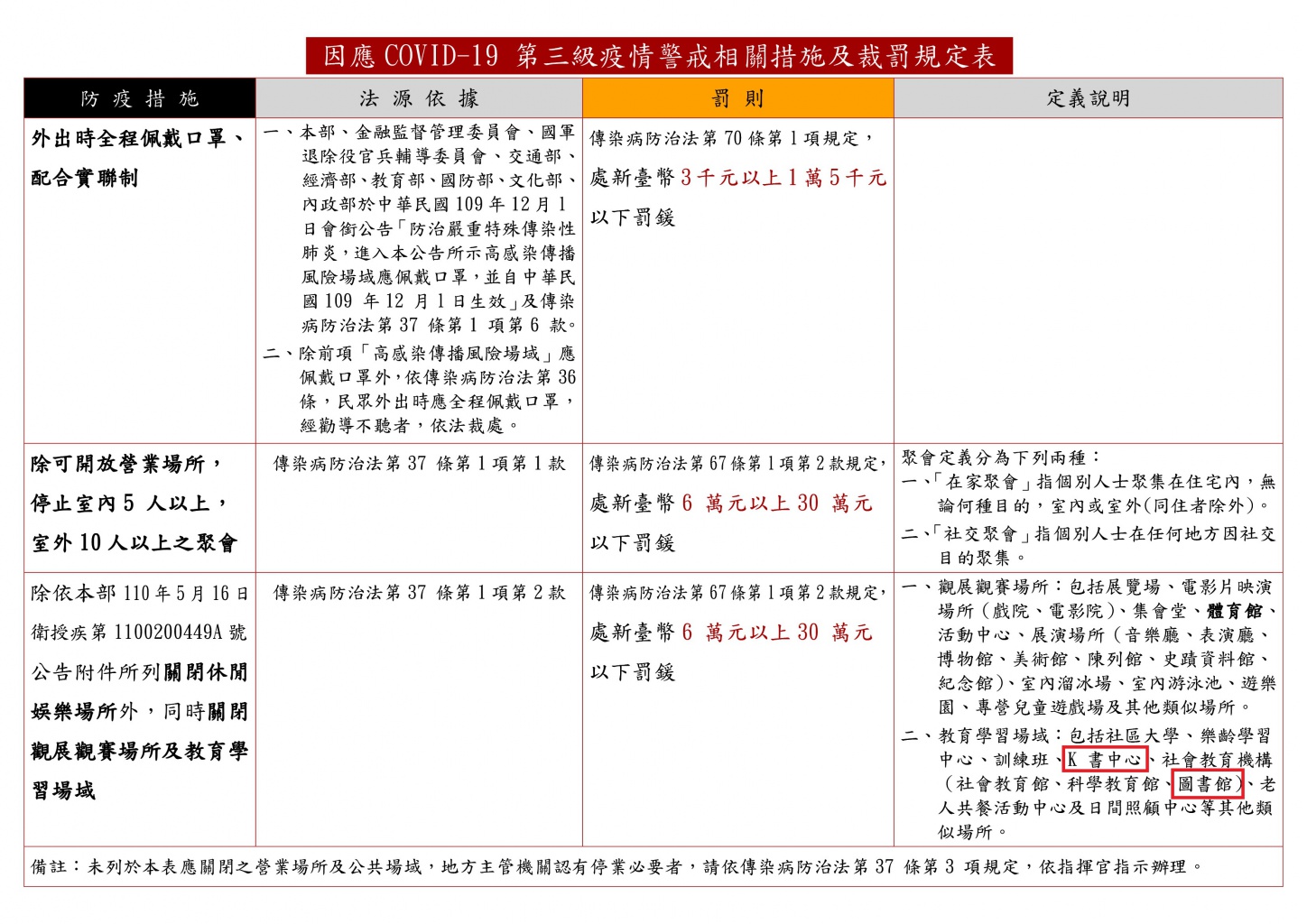配合教育部所發布之第三級疫情警戒與裁罰之規定,調整本館服務,詳見公告。