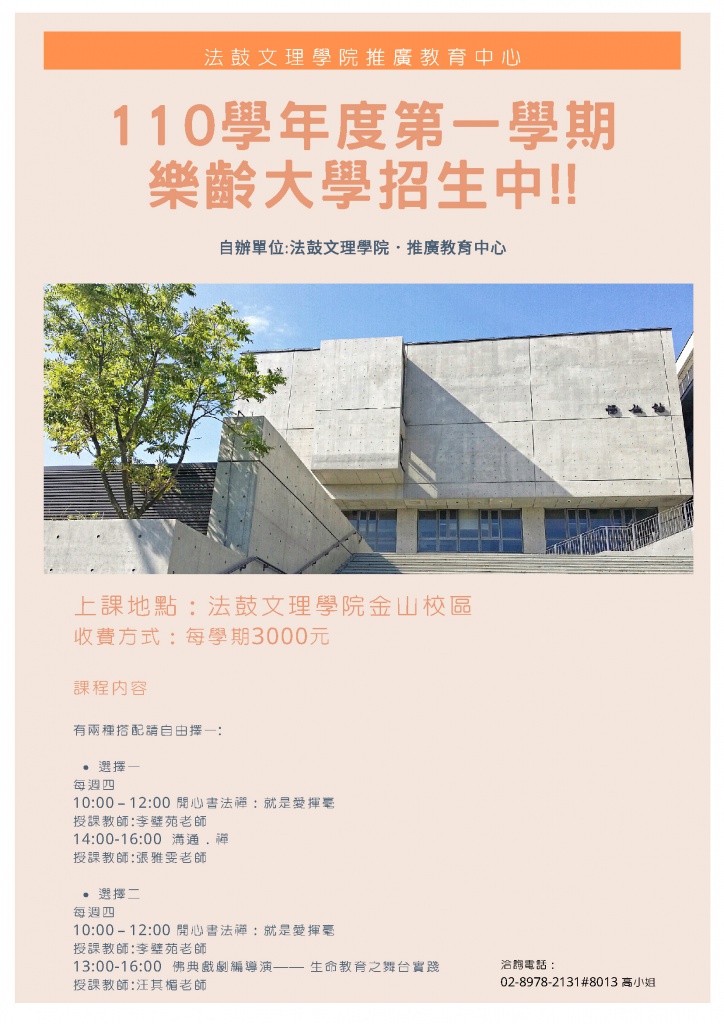 法鼓文理學院110學年度第1學期樂齡大學 參加對象:年滿50歲者,身體健康狀況良好者
